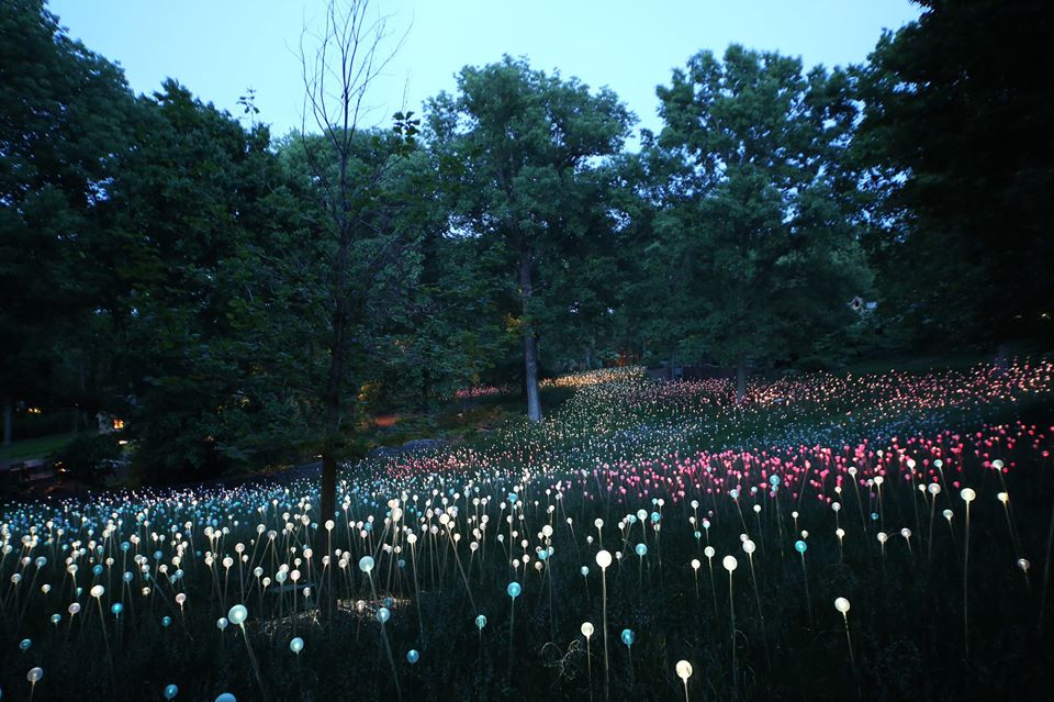 Cette installation comporte 20000 fleurs articifielles composées d’une tige de plastique surmontée de pétales en acrylique, posées le long d’un chemin d’un kilomètre qui parcourt les jardins. Ces tiges sont raccordées à des fibres optiques posées à même le sol, qui symbolisent les racines et viennent apporter à chacune de ces fleurs une lumière changeant perpétuellement et de manière individuelle.